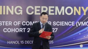 Ngày 15/12/2025, Học viện Công nghệ Bưu chính Viễn thông (PTIT) đã long trọng tổ chức Lễ khai giảng Chương trình Thạc sĩ ngành Khoa học máy tính giảng dạy bằng tiếng Anh (VMCS) khóa 2025 – 2027. Đây là sự kiện đánh dấu sự khởi động khóa đào tạo thứ hai của chương trình học bổng uy tín này, tiếp nối thành công của khóa đầu tiên vừa tốt nghiệp vào tháng 7/2025.
